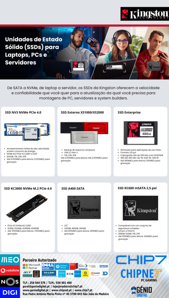 Confira a promoção especial de SSDs Kingston para laptops, PCs e servidores! Atualize seu computador com modelos NVMe, SATA e externos — velocidade e confiabilidade garantidas para todas as necessidades, seja uso doméstico ou profissional. Qualidade Kingston com opções para backup rápido, alta performance e proteção de dados. Promoção válida para diversas capacidades, com atendimento especializado para empresas e montadores.​​