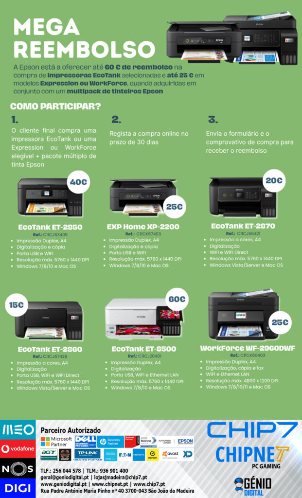 Com a compra de uma impressora EcoTank selecionada ou a compra conjunta de uma impressora Expression ou WorkForce selecionada e um pacote múltiplo de tintas Epson entre 01/09/2025 e 31/12/2025. Clique para enviar o seu pedido de reembolso.